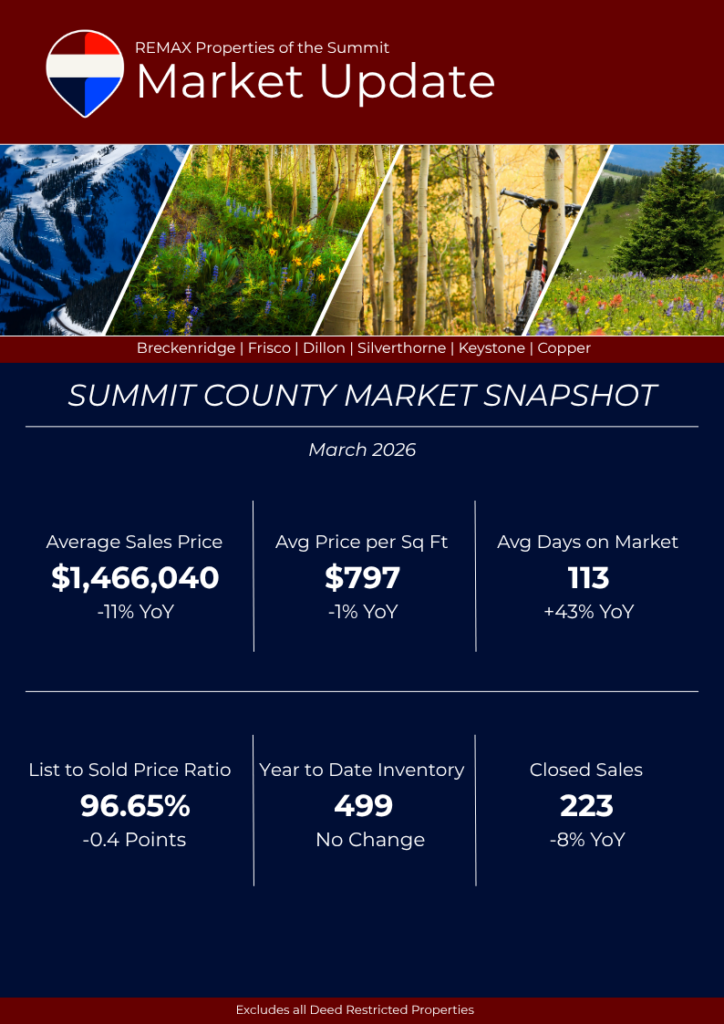 March sales in Summit County were down about 3% compared to March 2025, though the slowdown was less pronounced than what we saw in January and February. Buyer interest picked up in the luxury segment, helping push the average sold price up roughly 10% year-over-year.